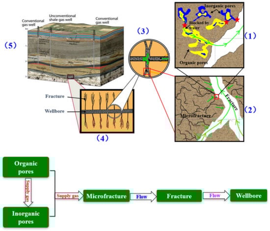 Micro and macro pathways for gas production from reservoirs. (1) Gas flow in shale nanopore system; (2) gas flow in micro-fractures; (3) gas flow in the branches of hydraulic fractures; (4) gas flow in the main pathway of the hydraulic fractures; (5) gas flow in the well bore.