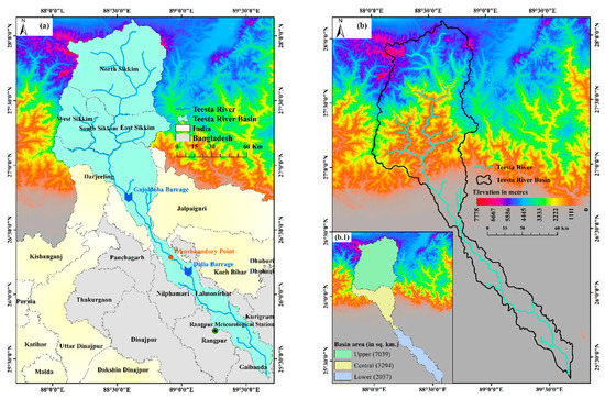 Map showing (a) geographical location of the Teesta river basin along with the administrative divisions, (b) elevation, and (b.1) area covered by the river basin.
