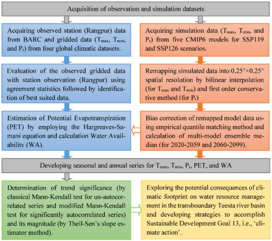 where n is the actual number of observations, n*S is considered as an effective sample of observations. In this study, all lags are considered to obtain a significant autocorrelation coefficient, as suggested by Hamed and Rao [65]. The entire methodological flowchart followed in this study is presented in Figure 2.