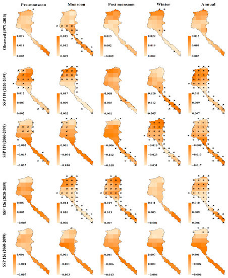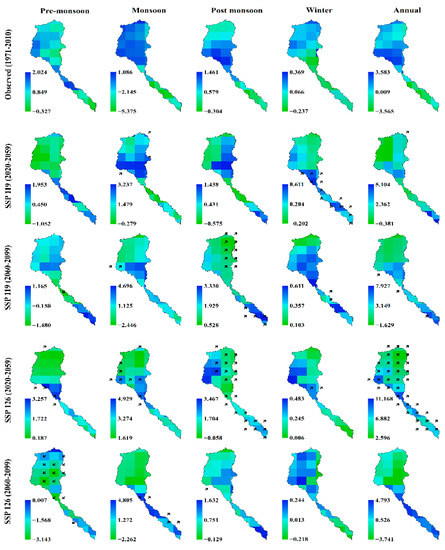 Figure 5 illustrates the trends and their magnitudes of the precipitation across the Teesta river basin for the observation period and two SSP scenarios. There was no significant trend in the entire basin during the observed period (1971–2010). However, in most of the lower parts (upper parts) of the basin, the negative (positive) trend was consistent in every season.