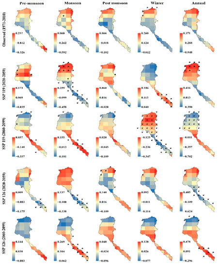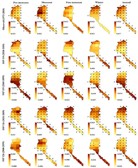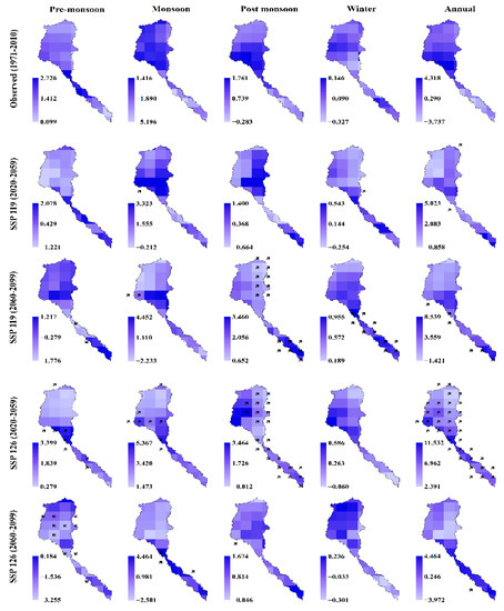 Considering the near future (2020–2059) in SSP119, there was a significant increasing trend in the lower parts of the basin during the winter, and some scattered significant increasing trends were found in the upper part of the basin during the monsoon season. The highest trend magnitudes during this period were observed during the annual (5.104 mm/year) and monsoon season (3.237 mm/year). In the far future (2060–2099), precipitation mostly increased significantly, except during the pre-monsoon season. Maximum significant increasing trends were seen in the post-monsoon season. Similar to the near future, the highest trend magnitude was found in the annual (7.927 mm/year) and monsoon season (4.696 mm/year); nevertheless, the magnitude was much higher in the far future. However, in both periods of SSP119, higher trend magnitudes were mostly observed in the lower parts of the basin.