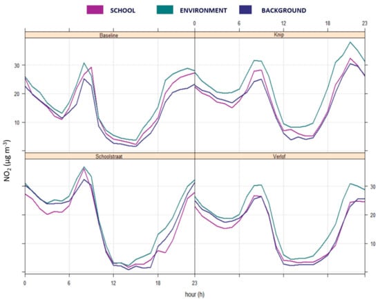 Time series graphs in Supplementary Figure S4 show realistic concentration dynamics throughout the monitoring campaign, and diurnal pollutant variability with distinct morning and evening rush hour peaks were observed for NO2, NO and PM1 (Figure 7). From the diurnal pattern of the monitoring locations and the implemented traffic scenarios, it becomes clear that similar pollutant dynamics are observed at all monitoring locations, with highest concentrations at the environment location (roadside, not impacted), followed by the school location (roadside, impacted) and the background location (no traffic). During school start times, concentration differences between the background and school location are highest for NO (16 µg m−3), followed by NO2 (4 µg m−3) and are only moderate for PM1 (<1 µg m−3). This can be explained by the fact that NO is emitted by traffic and rapidly oxidizes to NO2. NO can, therefore, be regarded as a short-lived pollutant, resulting in steep concentration gradients near roads (difference in background vs. school/environment location in Figure 7). The NO2 concentrations result from primary emissions and converted NO. NO2 can be transported over longer distances, and the ratio of NO/NO2 is the result of a complex photochemistry, resulting in a less direct relation of NO2 to traffic compared to NO. PM is predominantly influenced by background pollution and can be generated by a wide range of direct and indirect emission sources.