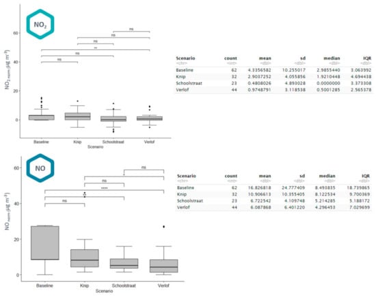 Based on the resulting boxplots and descriptive statistics of the normalized pollutant concentrations () in Figure 8, we can state that the average local NO2 contribution (during the scenarios; 8–9 h and 12–13 h/15–16 h) decreases from 4.33 µg m−3 (baseline) to 2.9 µg m−3 (−33%) during the knip scenario (one-way traffic restriction) and to ~0.5 µg m−3 (−89%) for the schoolstreet scenario (two-way traffic restriction). For NO, the air quality impact is even more significant, from 16.83 µg m−3 (baseline) to 10.91 µg m−3 (−35%) for the knip scenario and 6.72 µg m−3 (−60%) for the schoolstreet scenario. Finally, for PM1, we see no effects on the scenarios, with a negligible local PM1 contribution at the school location (0.06–0.31 µg m−3). The observed concentration differences between the traffic scenarios exceed the intra-sensor uncertainties quantified in the co-location campaigns (Table 3), and can therefore be explained by the implemented traffic scenarios.