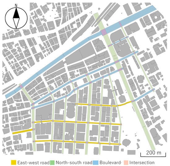 MRT is calculated by incident solar and infrared radiation to human body, which is calculated by surrounding surface temperature and view factors between the human body and surrounding surfaces. SET* is calculated by integrating the wind velocity and MRT distributions, by giving air temperature, relative humidity, a clothing amount, and a metabolic rate of the human body. Building shape and classification of the objective road is shown in Figure 1. The objective area is divided into 2 m mesh, and surface materials are set for each mesh. Asphalt, concrete block, and grass are set for the surfaces in the street canyons. The crown width and tree height of each street tree are set by a field survey and Google Earth.