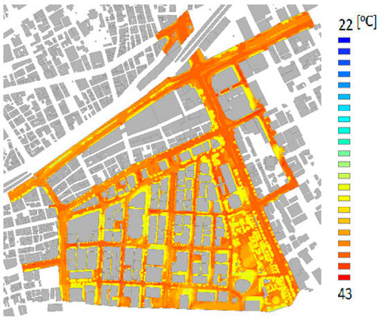 Distribution of SET* at 1.5 m high at 13:00 on 5 August 2020 is shown in Figure 2. Ground surface temperature is low in the shaded area by the surrounding buildings and trees. Since daily integral incident solar radiation is small in the shaded streets by street trees, surface temperature is low in both east–west and north–south roads. MRT is low in the median strip in some streets and the central park, where incident solar radiation and surrounding surface temperature are low. SET* is more affected by MRT than wind velocity. The calculation results were validated by the measurement results obtained on sunny summer days [].