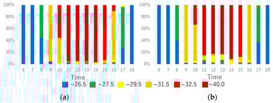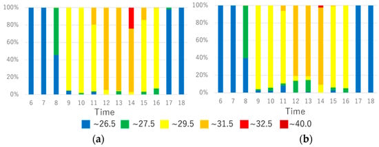 When water was sprinkled on the roads, diurnal variations of spatial distribution frequency of SET* at 1.5 m high on east–west road and north–south road on 5 August 2020 were calculated and are shown in Figure 5. Based on the experimental results with sprinkler vehicles, the calculations are carried out with an evaporation efficiency set at 0.15. When the surface temperature is high before water sprinkling, a surface temperature reduction is confirmed greater than 10 °C, and SET* is reduced up to 2 °C. Although the SET* reduction around noon is large, the water sprinkling does not lead to comfortable conditions because the conditions before water sprinkling are quite uncomfortable. Sprinkling water in the evening may increase the number of comfortable spaces.