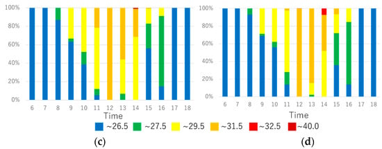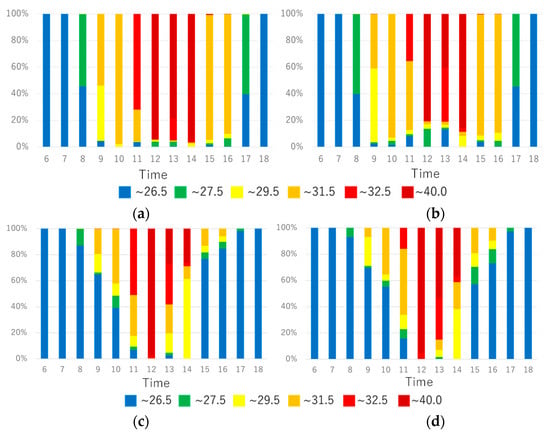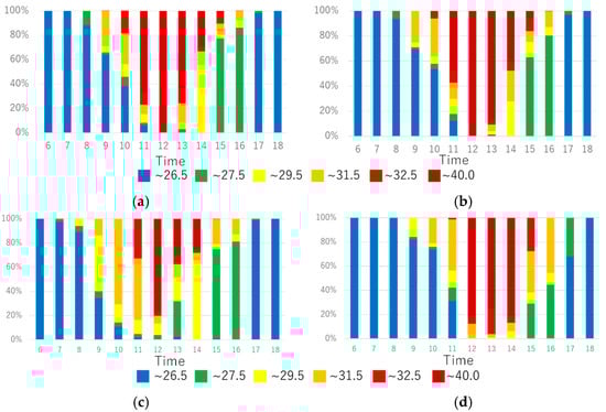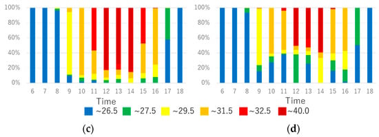 Diurnal variation of spatial distribution frequency of SET* at 1.5 m high on east–west road on 5 August 2020. (a) North side roadway, (b) south side roadway, (c) north side sidewalk, (d) south side sidewalk.