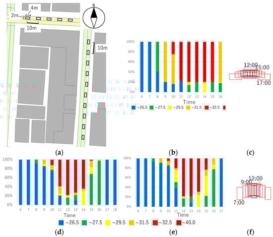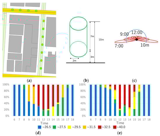 Diurnal variation of spatial distribution frequency of SET* at 1.5 m high on east–west road and north–south road on 5 August 2020, when street trees are installed. (a) street tree installation condition, (b) tree conditions, (c) diurnal shade change, (d) north side roadway, (e) east side roadway.