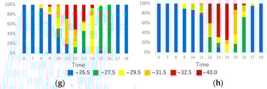Diurnal variation of spatial distribution frequency of SET* at 1.5 m high on east–west road and north–south road on 5 August 2020, when sunshades are installed. (a) sunshade installation condition, (b) north side roadway, (c) diurnal shade change, (d) west side roadway, (e) east side roadway, (f) diurnal shade change, (g) west side sidewalk, (h) east side sidewalk.