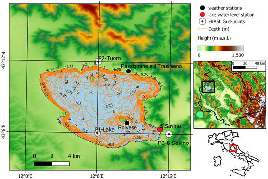 The Trasimeno lake is located in the Umbria region, Central Italy (Figure 1). The origin of the lake basin is linked to the tectonic phenomena concomitant to the final phases of the Apennine orogeny. It is a relatively small and shallow lake, with an average surface and depth of 122 km and 4.2 m (Figure 1), respectively; accordingly, it is characterized by a large surface to volume ratio [37]. Thus, Trasimeno lake is smaller than those addressed in the literature, with an extent of the order of km [17,23,31] or km [18]. For the reasons discussed above, about the possible use of models calibrated for larger lakes, this makes the Trasimeno lake case study of particular interest for evaluating the performance of the proposed approach.