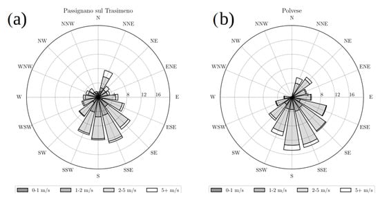 Ten meters wind rose at the two different weather stations in the lake area (black circles in Figure 1): (a) Passignano sul Trasimeno; (b) Polvese. Radial distance and shading indicate the percentage of days with wind direction in the sector and wind speed intervals, respectively.