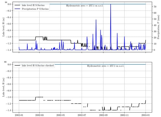 The validation check has been specifically applied to periods where the lake level is erroneously fluctuating between two values but it was not raining, as for example, around March 2002 (Figure 4). However, quite long periods of persistence of the lake level are probably due to the fact that indeed some weak rainfalls do not change the lake level significantly. This control, although elementary, provides a way of eliminating invalid data, which have been then disregarded in the following analysis. The final result, i.e., the validated data series of the lake level, is shown in Figure 4b for the period January 2002–January 2003, as an example.