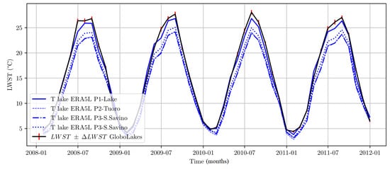 Due to the lack of ground-based evaporation observations, the ERA5L lake surface mixed layer temperature, , that is modeled prognostically by FLake, has been compared to the satellite observed Lake Surface Water Temperature (LSWT, C) provided by the Natural Environment Research Council (NERC) project Global Observatory of Lake Responses to Environmental Change (GloboLakes) [62]. This because is the FLake parameter related to the atmosphere in the evaluation of the evaporation from the lake and it is assumed to correspond to the lake surface temperature observations.