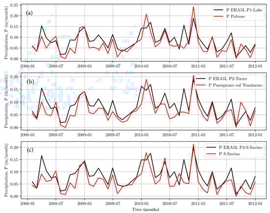 Comparison for the period 2008–2011 between the precipitation over the lake, P (m/month), observed at ground base by weather stations (reported in red), and the one, provided by ERA5L (in black), at: (a) P1-Lake vs. Polvese, (b) P2-Tuoro vs. Passignano sul Trasimeno, and (c) P3-S. Savino vs. S. Savino.