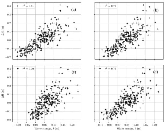Correlation analysis between the monthly variations of the lake level, , and water storage, , for the three ERA5L points closest to the lake: (a) P1-Lake, (b) P2-Tuoro, (c) P3-S. Savino, and (d) their weighted average.