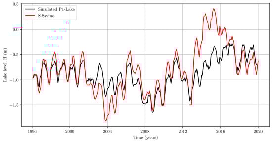 In Figure 8, the values of the monthly lake level, given by Equation (7), are compared to the observed ones. The simulated values are in good agreement with the observed ones and allow capturing the annual trend of the observed lake level.