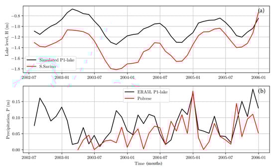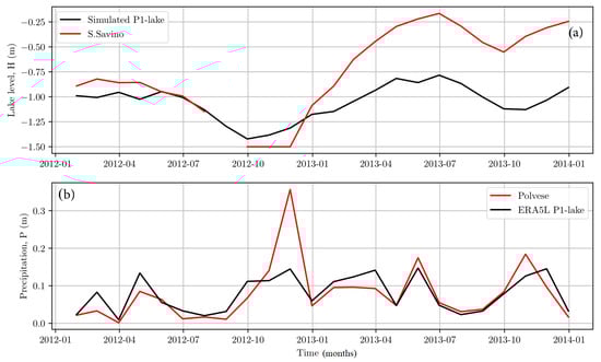 where = monthly variation of the lake level, and = P−E is the water storage. In other words, in this model, the basic assumption is that the precipitation and evaporation are the fluxes that mostly influence the water balance of a closed lake, like the Trasimeno one. This assumption has been verified by checking that the monthly mean runoff flux (surface and subsurface runoff), provided by the reanalysis, was of an order of magnitude smaller than the precipitation and evaporation fluxes (not shown). However, as already pointed out, this assumption might not hold either for other shallow lakes or under extreme hydrologic conditions during a period of heavy rainfall, when also inflow from groundwater does occur. Indeed, on one hand, the groundwater inflow from the aquifer is often negligible on an annual and monthly basis, as shown for other shallow lakes in the literature [63], but it may be important in wet years, during extreme precipitation events, when it recharges the lake [63]. On the other hand, some shallow lakes are highly influenced by surface runoff from rivers, which significantly influences the lake’s water balance [20,63], becoming more important under conditions of extreme precipitation [64]. However, surface runoff input in shallow lakes, as in the case of Trasimeno lake, is an order of magnitude smaller than the actual runoff from rivers or tributaries [17].