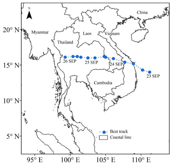 The best tracking data of the Japan Meteorological Agency (JMA) for Tropical Storm Dianmu is presented in Figure 1. The storm has caused widespread rainfall with heavy to very heavy rainfall over the central district of Vietnam, several provinces in Southern Laos, and Northeastern Thailand. There were eight reported deaths as a consequence of Tropical Storm Dianmu and resulting floods in Thailand and Vietnam, with another loss of 5 people and huge crop losses attributed as well [23]. The storm affected over 73,000 households, and the heavy rainfall caused floods in these countries. The significant feature of the system was that it extended its movement for 12 h close to the coast, resulting in unusually heavy rainfall.