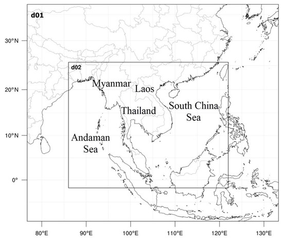 The WRF variational Data Assimilation (version 3.9.1) forecast model was used in this study due to its higher-order mass conservation characteristics and advanced physics. Three-dimensional winds, potential temperatures, geopotential, surface pressure, turbulent kinetic energy, and scalar were among the prognostic variables in the model, which was made up of fully compressible nonhydrostatic equations. Figure 2 shows the model configuration. The outer domain (d01) covered 226 × 196 grid points with a 27 km horizontal resolution, and the inner domain (d02) has 430 × 340 grid points with a 9 km horizontal resolution and with 31 vertical levels. The physics options included Eta microphysics [24], the Yonsei University (YSU) boundary layer scheme [25], the rapid radiative transfer model (RRTM) long-wave radiation scheme [26], the Dudhia scheme for short-wave radiation [27], the Noah land surface model, and the Betts–Miller–Janjic (BMJ) cumulus parameterization scheme [28].