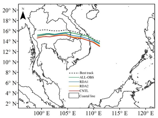 The model’s forecasts tracks with different assimilation experiments (i.e., ALL-OBS, RDA1, RDA2, and CNTL), along with the JMA best track data (black dashed line).