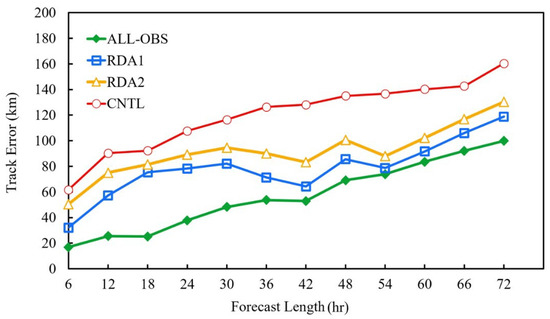 The tracking errors at every 6-h interval are presented in Figure 4, which shows that the assimilated radiances were significant affected by the tracking forecasts. The results signified that the forecast tracking errors were higher in the CNTL and RDA2 experiments, as compared to the RDA1 and ALL-OBS experiments. When the deterministic forecasts were preceded by a 6-h warm start analysis, a 20-km error existed at the initial time. As shown in Figure 4, in the first 24 h, the tracking forecast in the ALL-OBS assimilation gradually grew closer to the benchmark. The tracking errors in the ALL-OBS experiment were below 40 km in the first 24 h but had a sharp increase in the last 24 h. In other words, the assimilation of the AMSU-A, ATMS, and HIRS-4 channels reduced the forecast errors, as compared to the CNTL experiment. The track of the storm was better-predicted in the ALL-OBS experiment and more obvious in the short-range forecast (up to ~24-h lead time) than the medium-range forecast, as compared to the CNTL experiment. In addition, the tracking errors of the ALL-OBS experiment were typically smaller than those in the CNTL experiment, with a maximal error of approximately 100 km.
