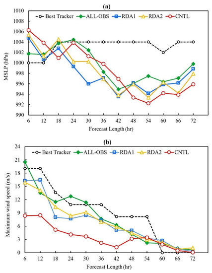 Figure 5 shows the time evolution of the forecasts in terms of the mean sea level pressure (MSLP) observed intensity (Figure 5a), and maximum winds (Figure 5b). The ALL-OBS experiment was found to be more accurate in forecasting the Tropical Storm Dianmu’s intensification and dissipation patterns, although the JMA best tracking data were more accurate in forecasting the peak intensity of the MSLP. The forecasted storm reached its peak intensity at 18 UTC on September 23 with an MSLP of approximately 1003 hPa while the observations reported an MSLP of approximately 1004 hPa at the same time. The ALL-OBS experiment showed a similar pattern for storm intensification, although the storm dissonated 6 h earlier than in the RDA2 experiment. The CNTL experiment failed to capture the storm’s dissipation, and the RDA1 and RDA2 experiments underestimated the storm’s peak intensity in terms of MSLP. In these forecasts, the MSLP was closer to the best JMA tracking data in the first 24 h, as compared to the CNTL experiment; thereafter, it was underestimated. When it came to the storm’s intensity, the CNTL experiment’s maximum wind speed consistently underestimated the storm’s rate of expansion throughout the entire forecast period. A peak wind speed of approximately 20 m/s was recorded in the ALL-OBS experiment, while the best JMA tracking data recorded a peak wind speed of approximately 18 m/s.