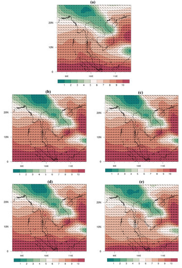 The 850 hPa circulation including wind field (vector, unit: m/s) at 00 UTC on 23 September 2021: (a) NCEP FNL analysis, (b) ALL-OBS, (c) RDA1, (d) RDA2, and (e) CNTL.