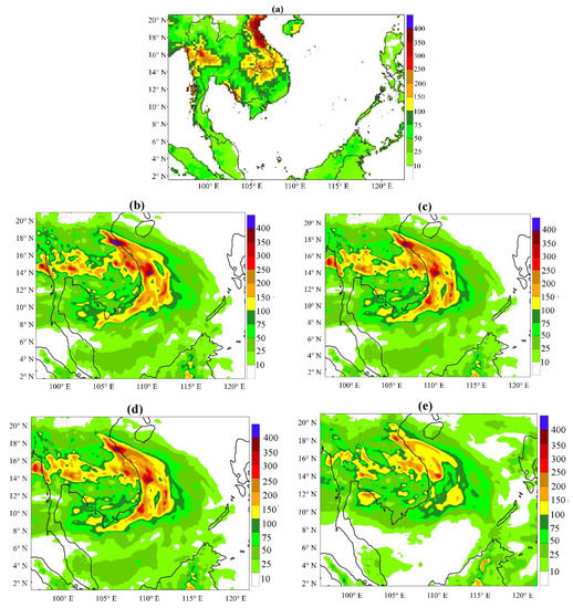 Spatial distribution of 72-h accumulated rainfall given by (a) CHIRPS analysis, (b) ALL-OBS, (c) RDA1, (d) RDA2, and (e) CNTL.