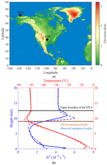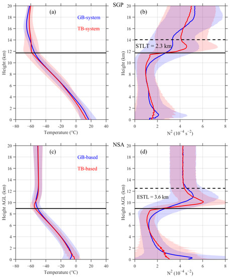 where and are the typical values of N in the troposphere and stratosphere, respectively; represents the hyperbolic tangent function; the tropopause height is taken to be the transition midpoint at ; and the tropopause sharpness is denoted . The above four parameters are calculated for each static stability profile by using a least-squares fitting method. To reduce a substantial amount of discretization-induced noise and preserve most of the detailed structure, the static stability profiles that were calculated from the radiosonde data are subsampled from a high vertical resolution of ~10 m to a lower vertical resolution by interpolating at an interval of 50 m [27,28]. The best initial estimates for the above parameters, i.e., = 0.0 s−1, = 25.0 × 10−3 s−1, and = 1 km, are adopted from Homeyer et al. [26]. The initial estimate for the tropopause height is taken as the value that is calculated from each radiosonde profile using the algorithm in WMO [6]. The tropopause sharpness and stability transition layer that are used in this study can express the transition between the troposphere and stratosphere from different perspectives as follows. The tropopause sharpness should characterize primarily areas with dramatic changes in stability around the tropopause, whereas the stability transition layer may additionally include a wider area with a slowly decreasing stability until a local minimum is reached in the stratosphere. In this regard, the tropopause sharpness may be recognized as part of the stability transition layer. A schematic of the tropopause profiles that were derived from the NSA site is shown in Figure 1 which marks the relevant heights and systems that were used in the study, including the temperature and stability profiles in the GB-system and TB-system, the observed tropopause height (recognized as the bottom boundary of the STLT), the upper boundary of the STLT, and the fitted tropopause height.