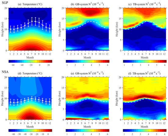 Monthly averaged climatologies of the temperature (a) and stability with respect to the ground level (b) and with respect to the tropopause heights (c) at SGP; panels (d–f) are similar to (a–c) but at NSA. The white line in each panel shows the monthly variation in the tropopause height, with the stand deviation presented in the left two panels.