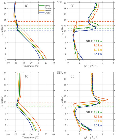 Seasonally averaged climatologies of the temperature (a) and stability (b) with respect to the tropopause heights at SGP; panels (c,d) are similar to (a,b) but at NSA. The vertical solid lines in green, red, yellow, and blue denote the seasonal variations in spring, summer, autumn, and winter, respectively, with the horizontal dashed line indicating the seasonal tropopause height. The depths of the stability transition layer around the tropopause (abbreviated as STLT in the figure) at SGP and NSA are also noted in the right two panels.