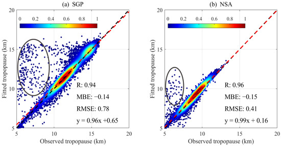 Data density plots of the observed and fitted tropopause heights at SGP (a) and NSA (b). The black dashed line in each panel denotes the 1:1 line, which highly overlaps with the linear regression line (dashed red line). The color bar shows the data density of the scatter points, with larger values representing a higher data density. The correlation coefficient (R), mean bias error (MBE; observed-fitted), root mean square error (RMSE), and linear regression equation between the two tropopause retrievals are also noted. The black ellipses delineate a few outliers that were induced by mismatches between the observed and fitted tropopause heights when multiple tropopause heights are identified on one radiosonde profile.
