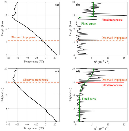 According to the algorithm in WMO [6], the thermal tropopause that was used in this study is defined as the lowest level where the temperature lapse rate falls below 2 K km−1 and where the average temperature lapse rate between this level and all the higher levels within 2 km remains below this value. The thermal tropopause is directly related to the enhanced static stability [5,16,20,22] that is usually represented by the Brunt-Väisälä frequency N or its square as follows in Equation (1):