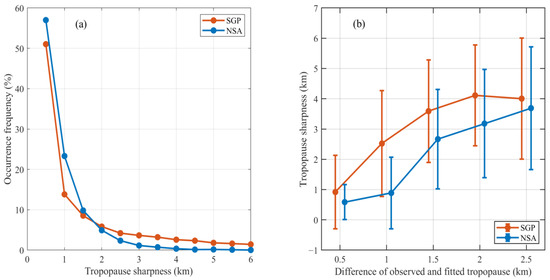 Figure 7a shows the occurrence frequencies of the tropopause sharpness that was derived from the fitted method at both sites. Most values of the tropopause sharpness are less than 0.5 km, accounting for 51.0% and 57.0% at SGP and NSA, respectively, beyond which (tropopause sharpness >0.5 km) the occurrence frequency declines gradually. Homeyer et al. [26] divided the tropopause sharpness (λ) into two categories, i.e., narrow (λ ≤ 2 km) and broad (λ > 2 km), on the basis of the results from the continental United States for several months in 2008. The percentage of broad tropopause sharpness values at SGP in this study is 20.8%, which is relatively close to the magnitude (19.5%) in Homeyer et al. [26] at similar latitudes (35–40° N). Moreover, although their study areas uncovered the Arctic, Homeyer et al. [26] reported a decreasing frequency of broad tropopause sharpness values with increasing latitude. This latitude variation trend is affirmed by the results of this study, as shown by the broad tropopause sharpness occurring more frequently at the extratropical SGP (20.8%) than at the Arctic NSA (5.0%). Previous studies have suggested that frequently occurring broad tropopause sharpness in low latitudes may be associated with the dynamic and radiative characteristics of the tropical upper troposphere [33], while a broad tropopause sharpness might primarily exist in the midlatitudes within lower-stratospheric cyclonic flows [9,17]. The relationship between the tropopause sharpness and the absolute difference of the observed and fitted tropopause is presented in Figure 7b, revealing a clear variation trend at both sites in which the tropopause sharpness increases with an increasing absolute difference. The rapid variation in the static stability around the tropopause will generate narrow tropopause sharpness, and for these cases the fitted tropopause are generally consistent with the observed tropopause.
