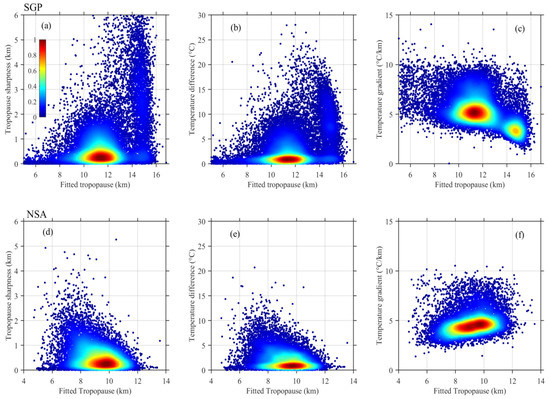 Density plots of the tropopause sharpness (a), temperature difference (b), and temperature gradient (c) as a function of the tropopause height at SGP; panels (d–f) are similar to (a–c) but at NSA. The color bar shows the data density of the scatter points, with larger values representing a higher data density.