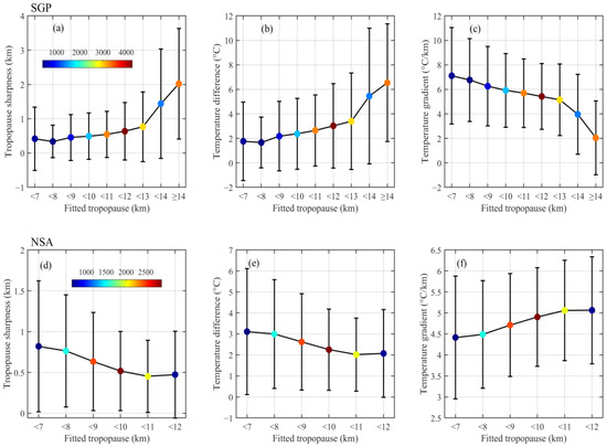 Average values and standard deviation of the tropopause sharpness (a), temperature difference (b), and temperature gradient (c) as a function of the fitted tropopause height at SGP; panels (d–f) are similar to (a–c) but at NSA. The color bar shows the number of data points in each bin off by 1 km on the x-axis (for example, <10 on the x-axis denotes the fitted tropopause height between 9 and 10 km).