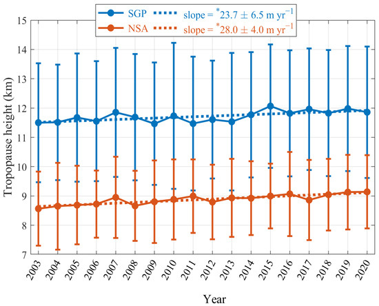 The long-term radiosonde measurements at the two sites allow the interannual variation trend of the observed tropopause height to be investigated, as shown in Figure 10. The annual variation in the tropopause height presents a significant positive trend during 2003–2020, with magnitudes of 23.7 ± 6.5 m yr−1 and 28.0 ± 4.0 m yr−1 at SGP and NSA, respectively. Although there is an overall increasing trend for tropopause height at SGP, it is less linear than the trend at NSA, as indicated by a larger standard deviation change at SGP across the study period. Seidel and Randel [2] indicated that the tropopause height trends over 1980–2004 were increasing at almost all of the radiosonde stations that they analyzed, yielding an estimated global trend of 6.4 ± 2.1 m yr−1. Therefore, the rates of increase at the two sites that were investigated in this study are approximately quadruple the global average magnitude that was reported in Seidel and Randel [2], although the research periods between this study and theirs are inconsistent. It has been suggested that changes in the tropopause height may be a sensitive indicator of anthropogenic climate change [4,34,35] and that the changes are accompanied by stratospheric cooling and tropospheric warming [2,4]. Owing to the unique feedbacks in the climate system, the phenomenon that is known as Arctic amplification has occurred throughout this region because the warming over this area is occurring two to three times faster than the global rate [36]. Continuous warming has led to a steady decline in Arctic sea ice cover over time [37]; therefore, it is reasonable to expect a positive feedback to Arctic warming, thereby accelerating its warming rate [38]. Our study preliminarily demonstrates that the rate of increase in the tropopause height has occurred faster at NSA than at SGP over almost the past two decades. Accordingly, further study is required to investigate whether this rate difference is associated with accelerated warming in the Arctic.