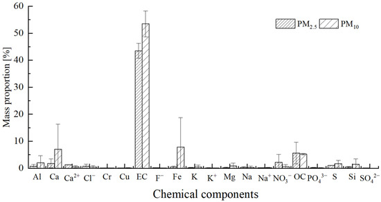 The mass proportions of major chemical components in PM10 and PM2.5 were shown in Figure 1. The results showed that the mass proportions of major chemical components in PM2.5 were EC, OC, NO3−, Ca, Ca2+, S, Al, Cl−, Si, Fe, Na and Mg, successively. In addition, the mass proportions of major chemical components in PM10 were successively EC, Fe, Ca, OC, Al, S, Si, Mg, NO3−, Ca2+, Cl− and K+, successively.