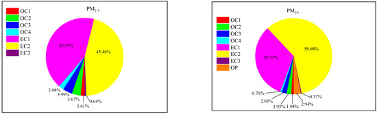 The proportions of eight carbonaceous components in total carbon from carbon plant were presented in Figure 2. As shown, EC1 and EC2 are very high in total carbon, accounted for over 85% of total carbon. The mass fractions of EC1 and EC2 in PM2.5 were 42.55% and 45.46%. As for PM10, the mass fractions of EC1 and EC2 were 32.35% and 58.68%. OC1, OC2, OC3, OC4, EC1 and EC3 accounted for a higher proportion of total carbon in PM10 than in PM2.5. In PM10, only EC2 accounted for a higher proportion of total carbon than in PM2.5. No OP was detected in PM2.5.
