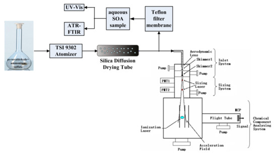 Researchers often prepare a certain concentration solution according to the concentration of organic and inorganic substances in the atmospheric aqueous phase, and then evaporate water to simulate the generation of aqSOA particles. The solution is generally atomized by a commercial atomizer (TSI 3076 or TSI 9302) to generate liquid aerosol particles, and then the water is evaporated through a silica gel diffusion tube to form the aqSOA particles [23,37]. Some researchers have also removed the water by rotary evaporation of the solution at a certain temperature to obtain aqSOA particles [38]. The latter is the evaporation of water in the solution under the condition of a relatively high temperature and rotational vibration, which can quickly complete the aqueous reaction and evaporation of water but cannot adequately simulate the actual atmospheric aqueous reaction process. Therefore, the former method is adopted in this study. A total of 3.303 g ammonium sulfate is dissolved by deionized water and transferred to a 250 mL volumetric flask; 2 mL of 40% pyruvaldehyde solution is added to the flask and the mixed solution of 5 mmol/L of pyruvaldehyde and 10 mmol/L of ammonium sulfate is obtained after constant volume by deionized water. Then, the mixed solution is transferred to a TSI 9302 atomizer. As shown in Figure 1, the mixed solution is atomized at a pressure of 0.83 × 105 Pa to generate aerosol particles with a particle size ranging from 0.1 to 2 μm. After drying through a silica gel diffusion tube, aqSOA particles with the concentration of about 200 μg/m3 are achieved. The aqSOA particles are detected on-line by an aerosol laser time-of-flight mass spectrometer (ALTOFMS) [39,40].