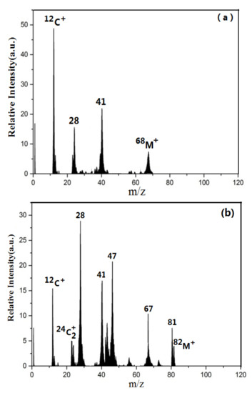 There are mass peaks with m/z of 12, 28, 41 and 68 in the average positive-ion mass spectrum of imidazole particles as displayed in Figure 2a, among which m/z = 12 is the C+ ion mass peak that is generated by the cracking of an organic compound [45]. Imidazole is a five-membered ring structure containing nitrogen atoms, which is relatively stable. With a mass peak at m/z of 68, its mass-charge-ratio is the same as the molecular weight (Mw) of imidazole, corresponding to the molecular ion peak of imidazole (M+, C3H4N2+) [23,46]. As suggested by Lee et al. [23] and Liu et al. [46], the molecular ion of imidazole may be fragmented to generate characteristic ions of C2H3N+ (m/z = 41) and CH2N+ (m/z = 28). The averaged positive ion-mass spectrum of 4-methyl-imidazole particles illustrated in Figure 2b obviously has imidazole characteristic ion peaks with m/z = 67 (C3H3N2+), m/z = 41 (C2H3N+) and m/z = 28 (CH2N+) [23,46]. In addition, there is an obvious mass peak at m/z = 82 in Figure 2b, which is considered to be the molecular ion peak of 4-methyl-imidazole (M+, C4H6N2+) as the mass-to-charge ratio is the same as its molecular weight. The mass peaks of m/z = 81 may correspond to the ion peaks of one methyl group on the imidazole ring ((C3H2N2+ CH3)), which is generated by the loss of a hydrogen atom in the molecular ion peak of 4-methyl- imidazole [47].