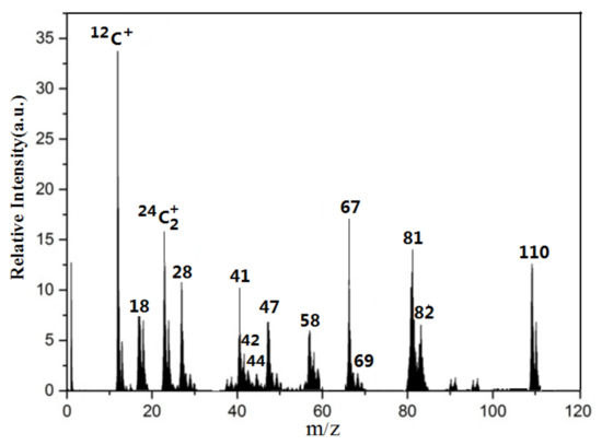 The off-line analysis method’s sample preparation procedure is cumbersome and time-consuming, so it cannot provide component information quickly. Based on this, this study carries out on-line detection research with the help of ALTOFMS [39,40]. In order to confirm whether the ALTOFMS can be used for the detection of imidazole compounds, the laser desorption/ionization of imidazole compounds are carried out first. A total of 100 mL of 0.1 mmol/L imidazole, 4-methyl-imidazole, imidazole-2-carboxaldehyde and 4-methyl-imidazole-2-carboxaldehyde solution is successively transferred to TSI 9302. After atomization and drying, the SOA particles are generated and entered into ALTOFMS for detection. The generated positive ions are measured by time-of-flight mass spectrometry to acquire the positive-ion mass spectrum of a single particle. According to the design principles of ALTOFMS, the laser desorption/ionization mass spectrum of a single particle is only obtained once its diameter has been measured [39,40]. A total of 200 single aerosol particles’ mass spectra are collected for each sample, and the averaged mass spectra of all particles are taken as the mass spectrum of the substance. The averaged laser desorption/ionization positive-ion mass spectra of imidazole, 4-methyl-imidazole, imidazole-2-carboxaldehyde and 4-methyl-imidazole-2- carboxaldehyde particles are shown in Figure 2 and Figure 3, respectively.