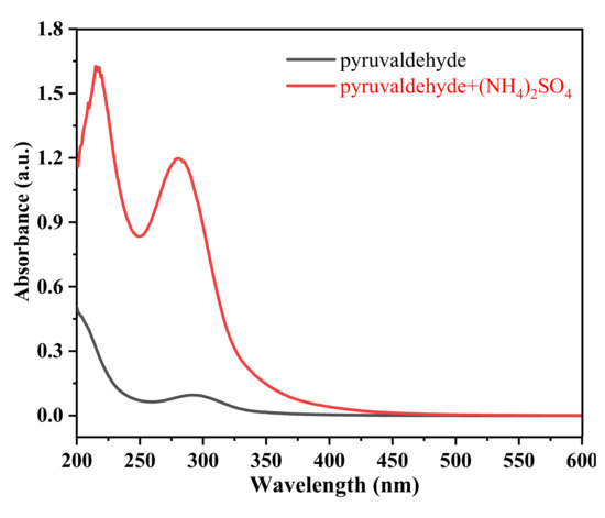 A total of 5 mmol/L of pyruvaldehyde and the mixed solution of 5 mmol/L of pyruvaldehyde and 10 mmol/L of (NH4)2SO4 is atomized and dried to produce aqSOA particles, respectively. Taking 2% methanol water solution as a reference, the absorption spectra of the extraction solutions in 200–600 nm are illustrated in Figure 5. The extraction solution of the aqSOA particles that is produced by 5 mmol/L of pyruvaldehyde is colorless and transparent, and there is a weak peak at 292 nm which corresponds to the characteristic absorption peak of carbonyl [49]. However, the extraction solution of the aqSOA particles that are formed from the mixed solution of 5 mmol/L of pyruvaldehyde and 10 mmol/L of (NH4)2SO4 shows brown-yellow, and its absorption spectrum has strong absorption peaks at 217 nm and 282 nm, respectively, indicating the formation of the brown carbon products with light absorption ability. Nozière et al. [21], Kampf et al. [22], Lee et al. [23] and Maxut et al. [24] also detected these two similar absorption peaks when studying the aqueous reaction of glyoxal with (NH4)2SO4. They suggest that the π → π * electron transition of C=N in the heterocyclic ring of imidazole and imidazole-2-carbaldehyde produces the absorption peak of 209 nm, and the n → π * electron transition of C=N is responsible for the absorption peak of 280 nm. Compared with the reaction system of glyoxal and (NH4)2SO4, these two UV absorption peaks of the reaction products of pyruvaldehyde and (NH4)2SO4 shift by about 8 nm and 2 nm, respectively, suggesting the production of 4-methyl-imidazole and 4-methyl-imidazole-2-carbaldehyde.
