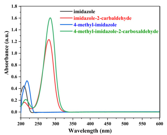 In order to further determine the component information of imidazoles, the absorption spectrum of the extraction solution is compared with imidazole compounds. A certain amount of imidazole, 4-methyl-imidazole, imidazole-2-carbaldehyde and 4-methyl-imidazole-2-carbaldehyde is dissolved successively in 2% methanol water solution to prepare the standard solution with a concentration of 0.1 mmol/L. Taking 2% methanol water solution as a reference, the measured UV-Vis absorption spectrum is shown in Figure 6. Imidazole has a characteristic absorption peak near 209 nm, which is similar to the UV-Vis spectrum that was reported by Maxut et al. [24]. They used water as a solvent and measured a characteristic absorption peak at 205 nm in the imidazole aqueous solution. A 2% methanol aqueous solution is used as the solvent in this study, and its characteristic absorption peak is red-shifted to 209 nm. Compared with imidazole, the characteristic absorption peak in the UV-Vis spectrum of 4-methyl-imidazole is red-shifted to 217 nm due to the existence of methyl substituent. Similar to the UV-Vis spectrum of imidazole-2-carbaldehyde that was measured by Maxut et al. [24], the UV-vis spectrum of imidazole-2-carbaldehyde shows a weaker absorption band at 215 nm and a maximum absorption peak at 280 nm; the latter is considered as the characteristic absorption peak of imidazole-2-carbaldehyde [9,24]. Further, the absorption peaks of 4-methyl-imidazole-2-carbaldehyde shown in Figure 6 are red-shifted to 217 nm and 282 nm due to the presence of methyl groups.