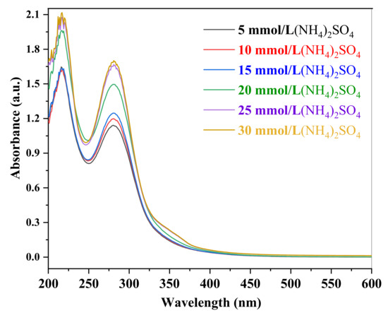 To further determine the imidazole components in aqSOA particles, 5 mmol/L of pyruvaldehyde and 5, 10, 15, 20, 25 and 30 mmol/L of (NH4)2SO4 mixed solution is prepared and transferred to TSI 9302, atomized and dried to obtain aqSOA particles, successively. The measured UV-Vis spectra of the extraction solutions of the aqSOA particles are shown in Figure 7. It can be seen from Figure 7 that the UV-Vis spectra of the extraction solutions are basically identical, with the absorption peaks at 217 nm and 282 nm. With the increasing concentration of (NH4)2SO4, the absorption peaks of the extraction solution do not shift, but the absorbance of 217 nm and 282 nm gradually increase. Combined with the UV-Vis spectra of 4-methyl-imidazole and 4-methyl- imidazole-2-carbaldehyde that are shown in Figure 6 and the on-line detection results of ALTOFMS, it can be confirmed that the main components of each extraction solution are 4-methyl-imidazole and 4-methyl-imidazole-2-carbaldehyde. As the intensity of the absorption peak at 217 nm is greater than that of 282 nm, it can be inferred that the amount of 4-methyl-imidazole is greater than that of 4-methyl-imidazole-2-carbaldehyde. It is worth noting that when the concentration of (NH4)2SO4 exceeds 25 mmol/L, the absorbance of the extraction solution at 217 nm and 282 nm remains almost unchanged. This is possibly because the pyruvaldehyde in the system is constant, and when the (NH4)2SO4 increases to 25 mmol/L, the pyruvaldehyde has been completely consumed and the produced 4-methyl-imidazole and 4-methyl-imidazole-2-carbaldehyde reach the maximum value. Upon continuing to increase the concentration of (NH4)2SO4, the yield of imidazole products almost stopped increasing, and the absorbance of the extraction solution remained almost constant.