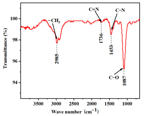 To identify imidazole products, ATR-FTIR is utilized to measure the infrared absorption spectrum of the extraction solution. During the measurement, 2% methanol water solution is used as the background, the scanning range is 400~4000 cm−1 and the resolution is 0.1 cm−1. The infrared absorption spectrum of the extraction solution after subtracting the background is displayed in Figure 8. In addition to the stretching vibration of methyl’s C-H near 3000 cm−1 and the stretching vibration peak of C-O at 1087 cm−1, the absorption band that is generated by the stretching vibration of C-N appears at 1453 cm−1, and the absorption peak at 1736 cm−1 corresponds to the stretching vibration of C=N bond [46]. This is in good agreement with the experimental results of Liu et al. [46] and Huang et al. [50] who also detected characteristic absorption peaks near 1450 cm−1 for the C-N bond and 1730 cm−1 for the C=N bond when they measured the infrared spectrum of the ammonia-aged SOA particles. This further confirms that imidazoles are the main components of the aqueous SOA that is produced by the reaction of pyruvaldehyde with (NH4)2SO4.