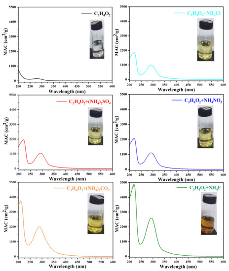 As the atmospheric aqueous phase contains different water-soluble anions, such as CO32−, F−, NO3−, SO42− and Cl−, they can affect the activity of the NH4+ ion and thus affect the optical properties of aqueous SOA particles. Therefore, the effects of water-soluble anions on the MAC of aqSOA produced by the reaction of pyruvaldehyde and ammonium ions are investigated in this study. A total of 5 mmol/L of pyruvaldehyde and 20 mmol/L of ammonium ions (10 mmol/L of (NH4)2SO4 and (NH4)2CO3,; 20 mmol/L of NH4F, NH4NO3 and NH4Cl) mixed solution is prepared and transferred to TSI 9302, atomized and dried to obtain aqSOA particles, successively. The extraction solutions of the aqSOA particles are shown in Figure 10. The extraction solution that is produced by pyruvaldehyde is colorless and transparent; the extraction solution that is formed from the aqueous reaction of pyruvaldehyde and NH4Cl, (NH4)2SO4 and NH4NO3 is beige; and the extraction solution that is produced by the aqueous reaction of pyruvaldehyde, (NH4)2CO3 and NH4F is brownish yellow and dark brown, respectively.