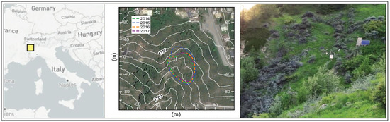 The measurement site (Figure 1) is located in Cogne, Valle d’Aosta, Italy (45.615 N, 7.3585 E, 1730 m a.s.l.). The site is on a 200 m long slope of about 26° in a small lateral valley with South-East aspect. The site is characterised by high incident solar radiation due to its topographic orientation. This results in large daily air temperature variations. The climate is continental, with cold winters and hot summers. In the period 1995–2019, the average yearly precipitation was 672 mm, and the average temperature was 5.3 °C. During the growing seasons (i.e., from June to September) in the same period, the mean temperature was 12.5 °C, whereas the average precipitation was 230 mm.