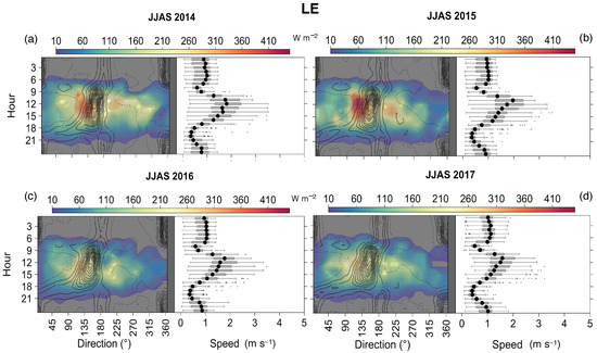 Mean latent heat flux () and wind frequency contour maps as a function of wind direction and hours of the day (left coloured panels) and wind speed mean diurnal cycle (right white panels) The left coloured panels show the wind direction contour lines (for both daytime and nighttime) and the latent heat flux colour map for the four average June-to-September periods, between 6:00 and 20:00, when most of the evapotranspiration occurs. The right white panels show the mean wind speed along the day, together with the standard deviation of values for each half-hour. Asterisks indicate outliers (i.e. values outside 1.5 times the interquartile range or IQR, above the upper quartile or below the lower quartile). Grey areas indicate no data (nighttime was excluded). Plot made using Metvurst R package [81]. (a) 2014. (b) 2015. (c) 2016. (d) 2017.