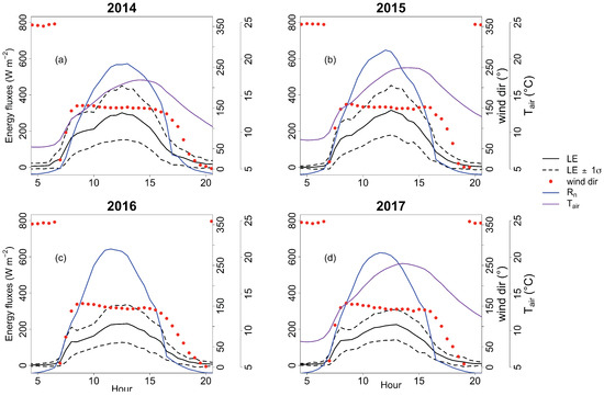 The flux mean diurnal cycle in wet growing seasons showed higher values than in dry growing seasons (Figure 3a,b compared with Figure 3c,d), with differences up to about 100 W m in the hours between 08:00 and 15:00. The range between ±1 was always near 100 W m ( 80 W m in 2017 and 130 W m in 2015, Figure 3a,b). The air temperature difference between 2014 and the other growing seasons was also visible in its mean diurnal cycle. In 2014, the mean air temperature was about 2 °C lower than in other growing seasons around midday, and the net radiation had the second highest variability after (up to around 70 W m, Figure 3), with 2014 being the year with lowest values due to frequent cloudy days and precipitation events. For H (Figure A5, Appendix A), the inter-annual differences in the hours 08:00–15:00 of the day were lower if compared to (no more than 42 W m), and the cycle variability (±1) was lower than the one found for (maximum 70.7 W m in 2016 growing season).